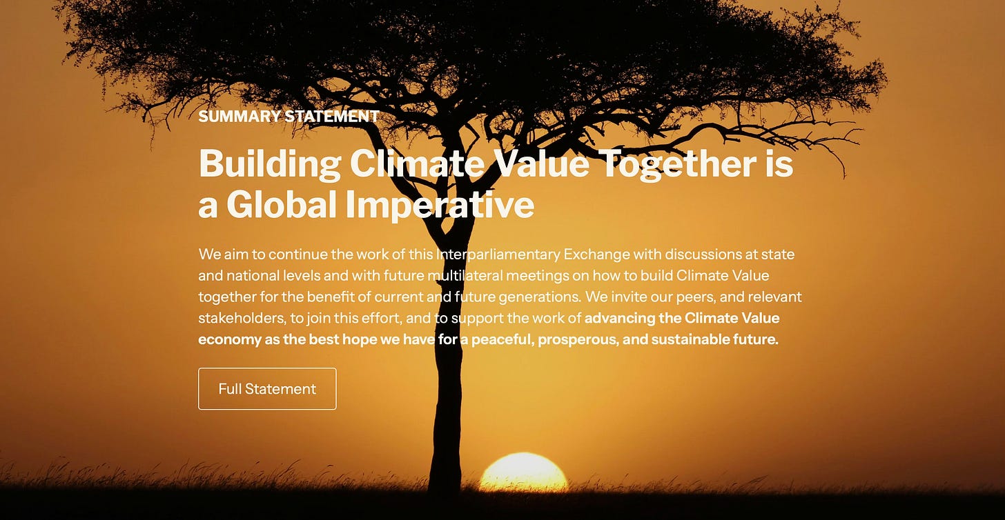 We aim to continue the work of this Interparliamentary Exchange with discussions at state and national levels and with future multilateral meetings on how to build Climate Value together for the benefit of current and future generations. We invite our peers, and relevant stakeholders, to join this effort, and to support the work of advancing the Climate Value economy as the best hope we have for a peaceful, prosperous, and sustainable future.