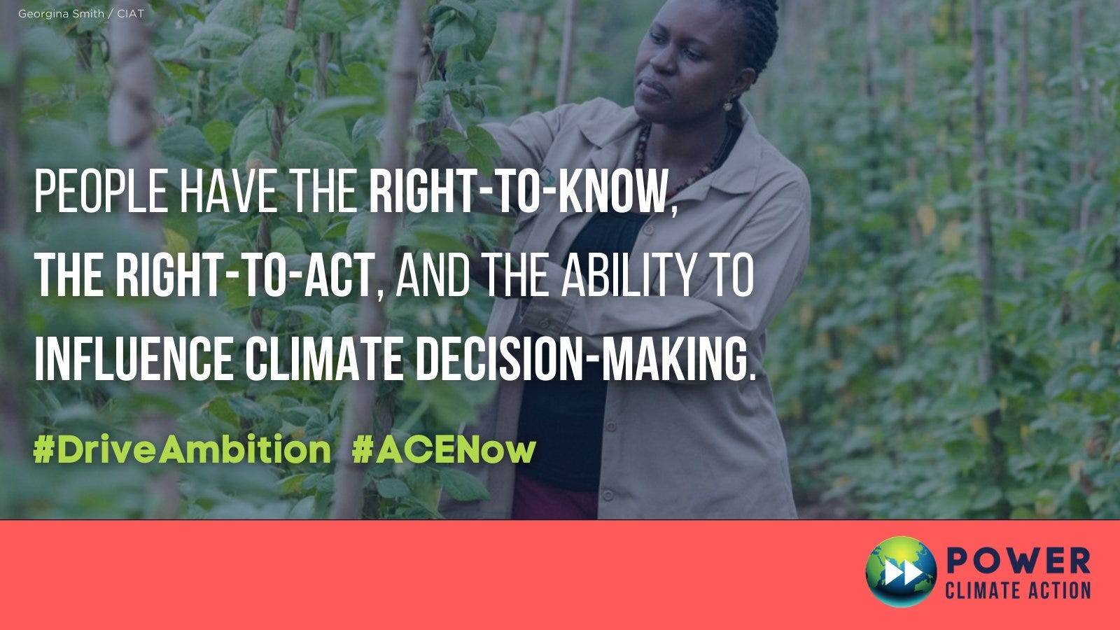 ACE encompasses 6 dimensions of information sharing and engagement: education, training, public awareness, public participation, public access to information, and international cooperation. The CCI view of ACE, which is shared by many in the Education, Communication, and Outreach Stakeholders (ECOS) community, is that participation is a necessary part of both the design of climate policy and the deployment of climate solutions.
