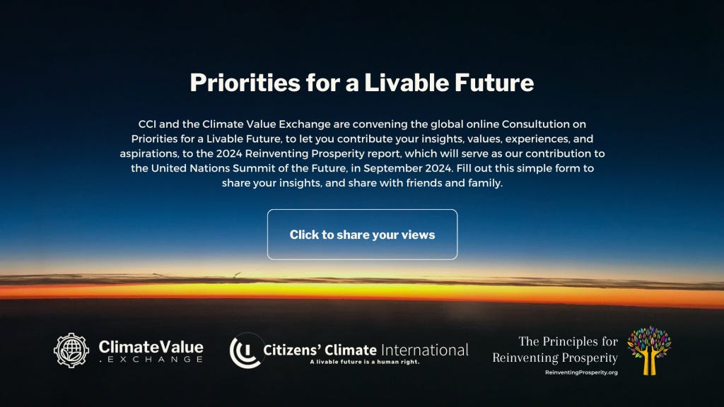 Please share the Consultation link with friends, family, colleagues, and with networks you feel would like to contribute to this report. Look for the 2024 Reinventing Prosperity Report to be released just ahead of the UN Summit of the Future, on Thursday, September 19, through the Climate Value Exchange.
