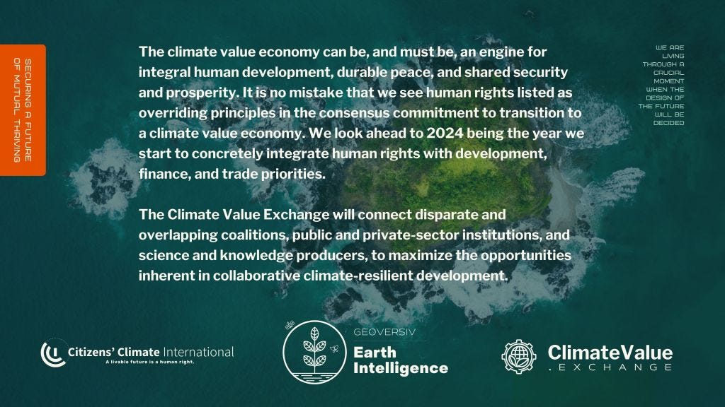 To advance the complex technical work required to transition to a humane, just, inclusive, and durable climate value economy, Geoversiv is joining with Citizens' Climate International and other partners, to support the Climate Value Exchange.