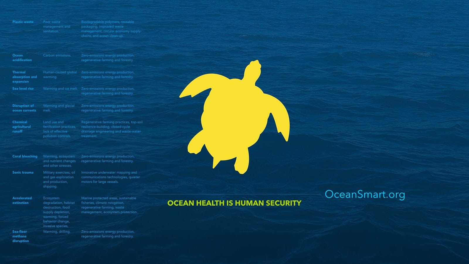 The global ocean makes up 99% of the biosphere, absorbs 90% of excess heat coming into the Earth system, anchors the stable climate system and the food web, and shapes the land and ecosystems we inhabit. We live on an ocean world, and though our diverse global civilization is land-based, human existence itself depends on a healthy ocean.