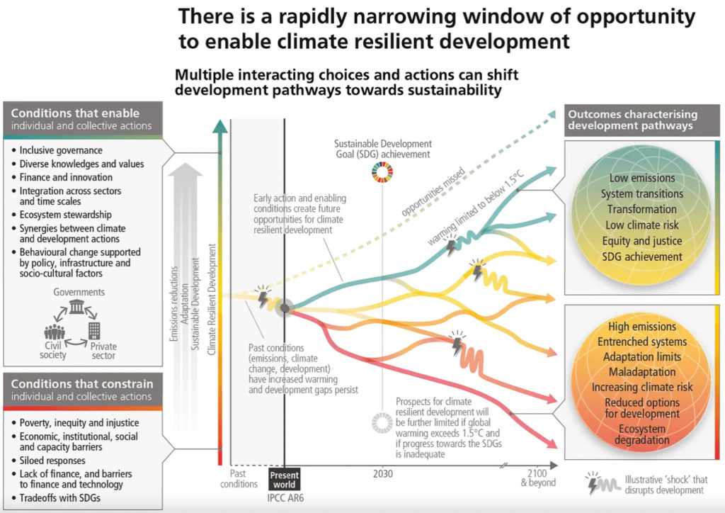 The Intergovernmental Panel on Climate Change has found in its 6th Assessment Report that the window for successful climate-resilient development is rapidly closing. Each decision that expands global heating pollution or leads to deforestation, nature loss or degraded biodiversity, makes it harder to stay on the green path toward a climate-resilient future with minimal climate shocks and related costs.