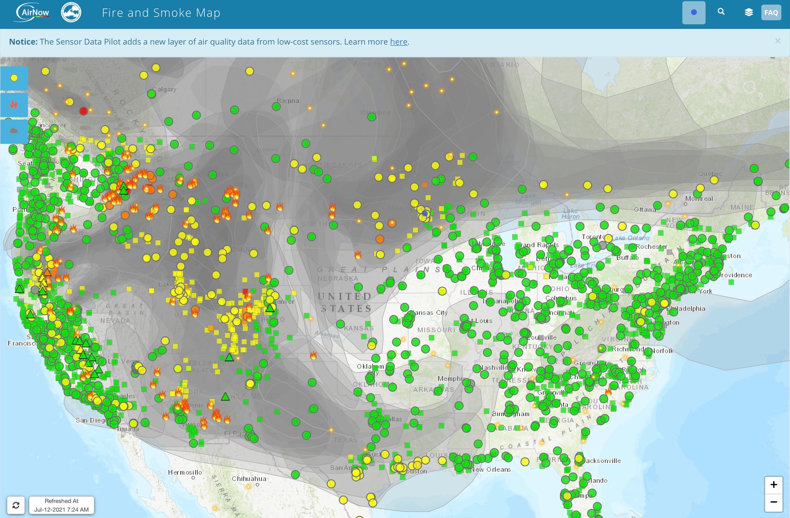 The AirNow Fire Map—from Esri, the National Oceanographic and Atmospheric Administraiton, the US Geological Survey, the Environmental Protection Agency, and other partners—shows the increasingly widespread wildfire smoke hazard, and the impact on ground-level air quality. The crisp Rocky Mountain air people expect to be pollution free is, at present, full of particulate pollution.