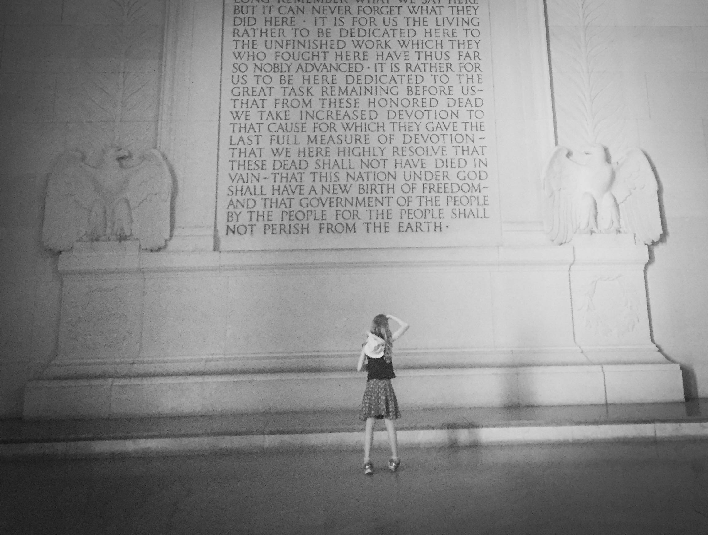 The image above was captured at the Lincoln Memorial in Washington, DC, on a spring day in 2016. The girl pictured used her hand to block the light, so she could read the words of Abraham Lincoln’s Gettysburg address. What is not seen is the spontaneous semi-circle of onlookers, who had come from around the world, giving her space to have this moment and acknowledging each other’s sacred appreciation of this communication between transcendent values and human innocence. Many had tears in their eyes for the beauty of this sacred moment, and for the knowledge that democracy must always be cared for and actively made real.