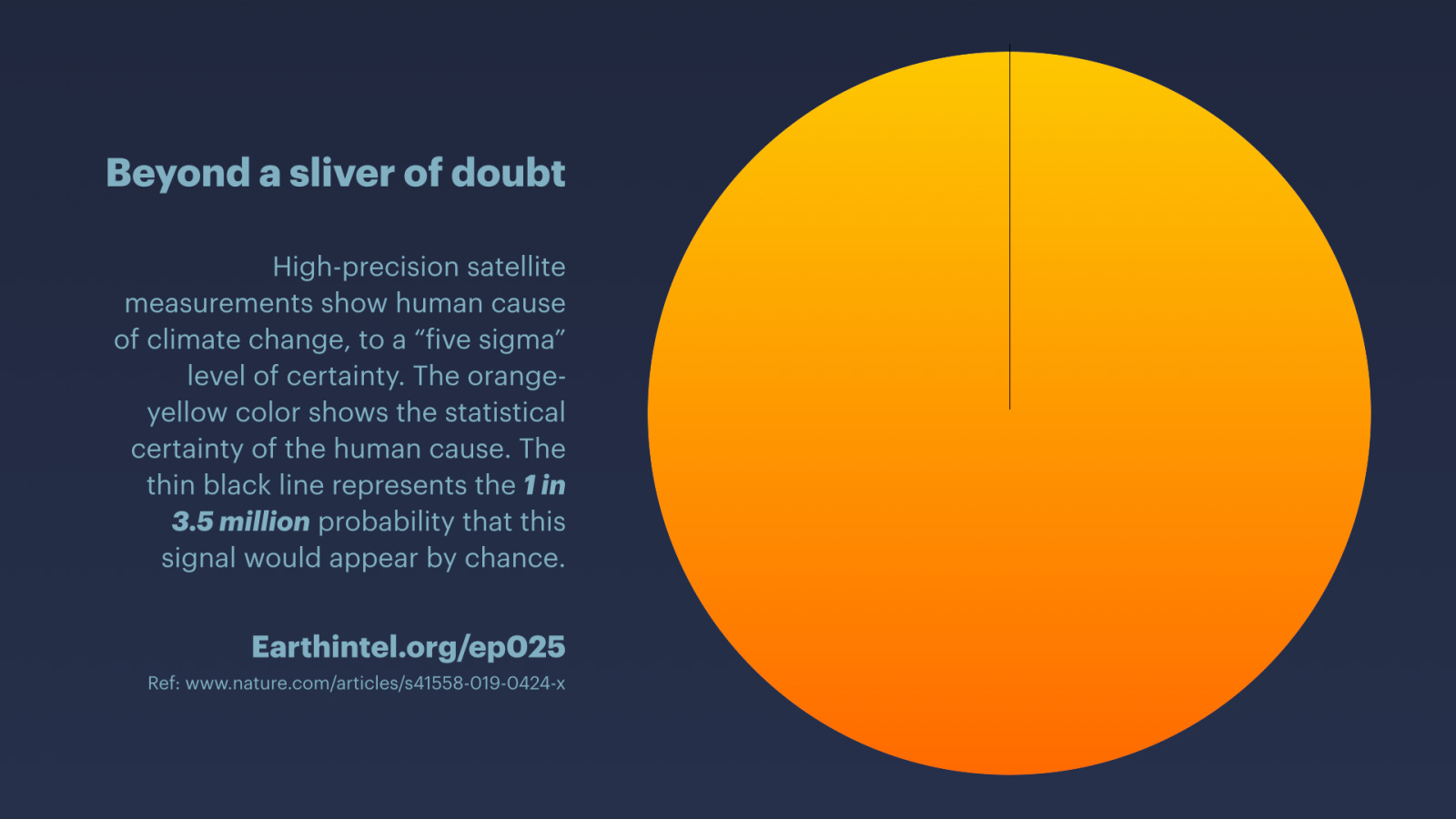 In 2019, Dr. Santer and a team of scientists reached a conclusion based on a complete analysis of all relevant data, and found to a “five sigma” level of certainty that human activity was causing climate change, primarily emissions from fossil fuels and land use. The five sigma “gold standard” means only 1 out of 3.5 million times could the observation in question occur by chance.